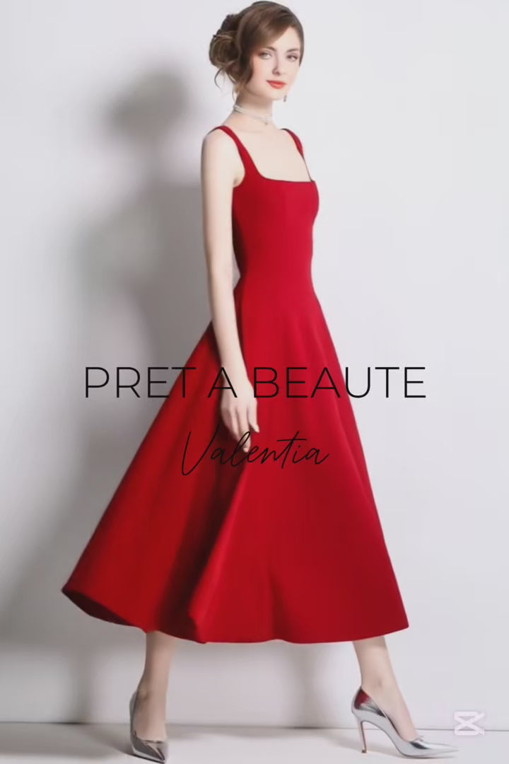 The Valentia dress channels timeless elegance through clean lines and a striking hue. Designed in a midi length with a square neckline and wide straps, it frames the silhouette with refined simplicity. A concealed zipper fastens at the back, while the skirt flows gracefully with every step, balancing structure and movement.